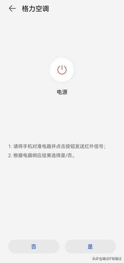 我们选择格力品牌,到这一步手机对准要遥控的设备,并点击电源按钮看设备是否有反应是否能够遥控到,如果可以则选择是继续。如果设备没有反应则选择否系统会自动再给你换下一组遥控器继续校准。一直换到可以遥控到设备的遥控器为止