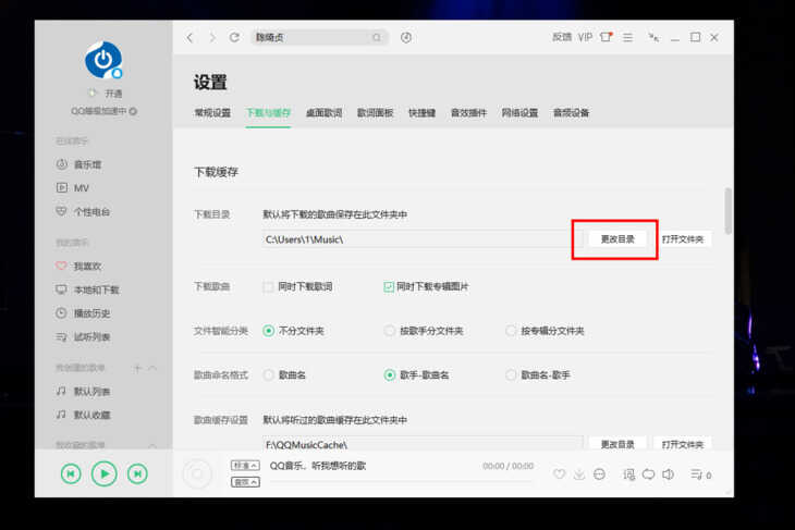 第四步:在“设置”窗口中找到“下载与缓存”,点击“更改目录”按钮(图中红框)。