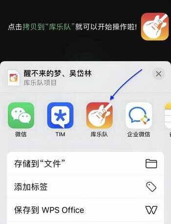 3. 在弹出的选项框中,点击【库乐队】图标继续。如果你手机上没有安装库乐队的话,iPhone会提示你进行安装。