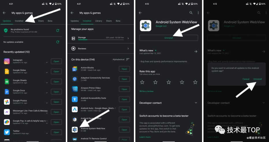 Android WebView是一个系统组件,它允许开发人员在其应用程序内显示网页。现在几乎每台Android设备预装了它,并且可以通过Play商店定期进行更新,以提供最新的安全性增强功能和修复程序。似乎是因为新版的发布,导致webview组件内出现bug,导致了这次集体的APP崩溃事件,只需卸载Android WebView更新即可解决崩溃问题。