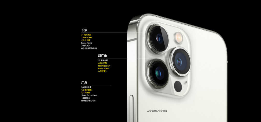 iPhone 13 Pro和iPhone 13 Pro Max配备Pro 级 1200 万长焦、广角、超广角摄像头系统。