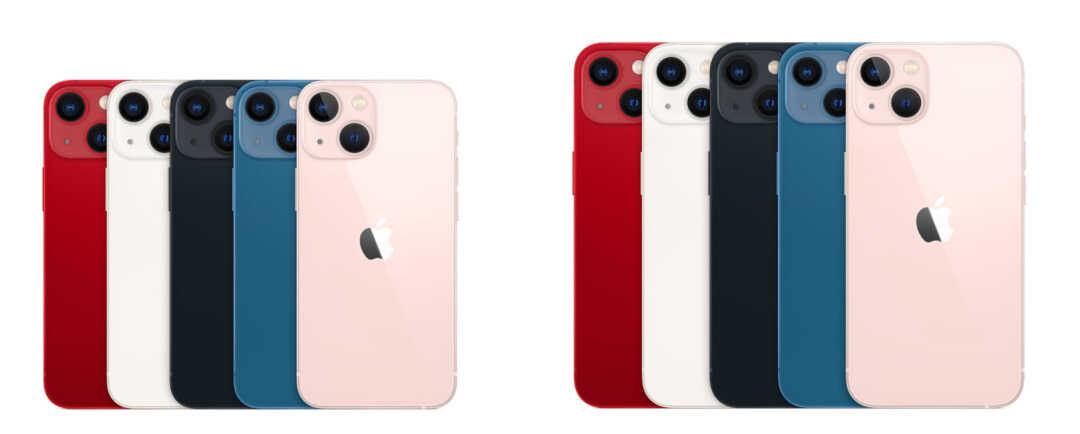iPhone 13和iPhone 13 mini采用玻璃背板,搭配铝金属边框,提供红色、星光色、午夜色、蓝色、粉色五种可选配色。
