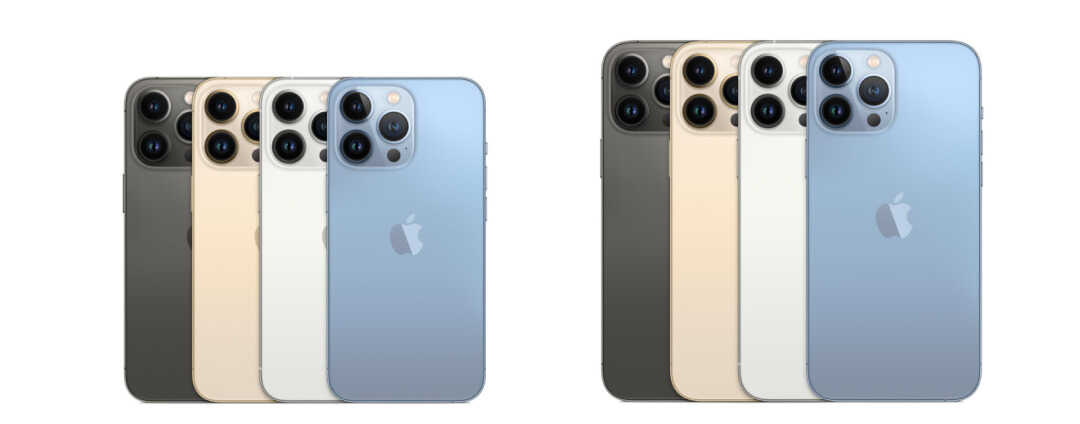 iPhone 13 Pro和iPhone 13 Pro Max采用亚光质感玻璃背板,搭配不锈钢边框,提供石墨色、金色、银色、远峰蓝色四种配色。