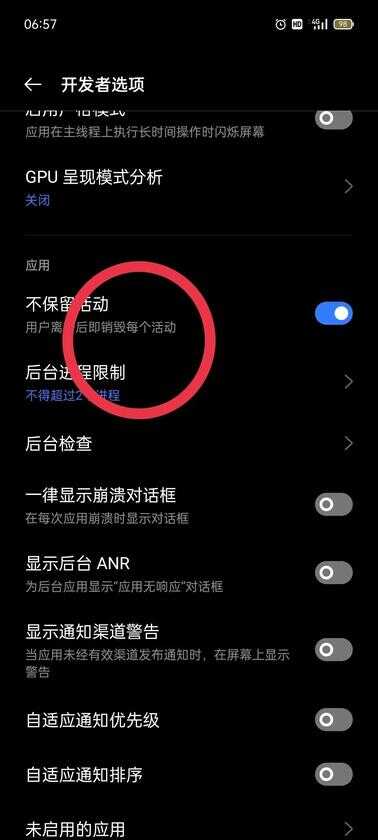 第九步:在开发者选项里面找到不保留活动选项,这个设置好后有的手机登陆软件时手机有可能不好用,如果有问题可以再打开这个选项!