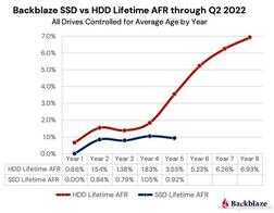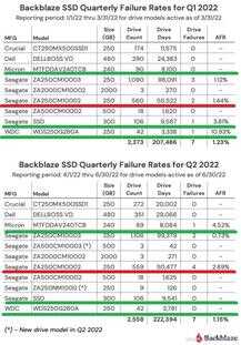 https://www.backblaze.com/blog/ssd-drive-stats-mid-2022-review/),就是那个用消费级硬盘来做存储服务的公司,他们使用的SSD中,最老一批已经达到了很多厂商的质保年限——5年。先看看两个季度的统计。