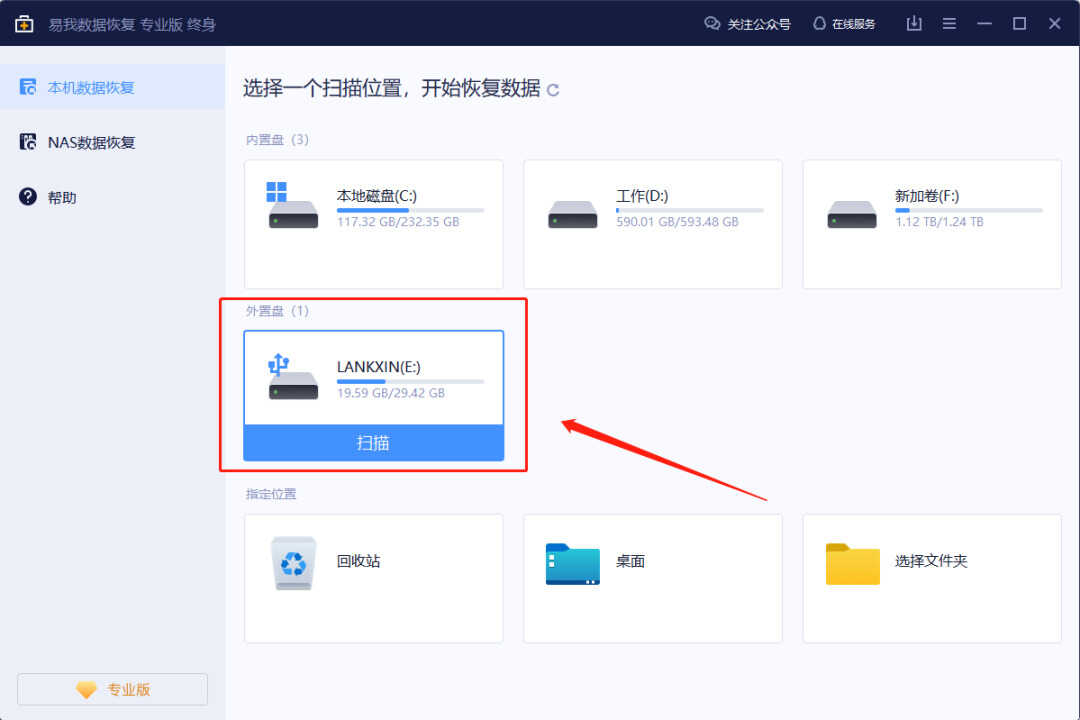 1.在计算机上插入U盘并运行易我数据恢复软件,点击首页U盘【扫描】开始查找需要恢复的重要数据。
