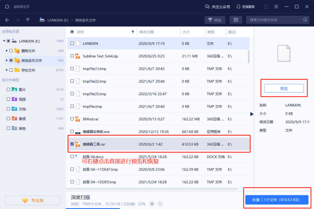 2.扫描完成后可以对找到的数据进行预览或者直接恢复。(如果在扫描中途发现需要的文件,可以随时暂停进行恢复。)