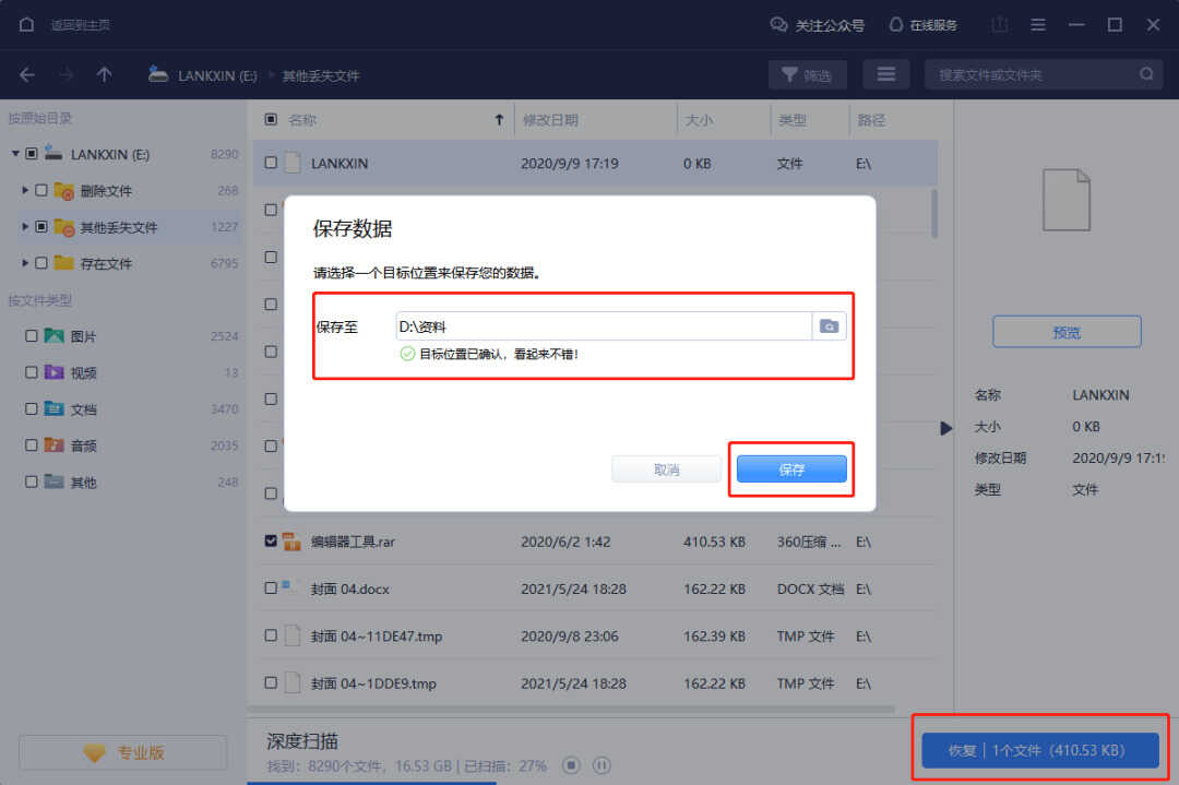 3.预览确定没问题后,点击恢复并在弹出的窗口选择保存位置并保存,即可恢复U盘里的数据。(注意:千万不要将恢复的数据保存到U盘,以免数据被覆盖彻底丢失或损坏!)