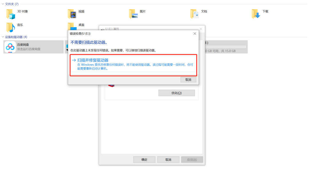修复完成后再打开U盘看是否还提示需要格式化,不显示的话就说明U盘正常了。