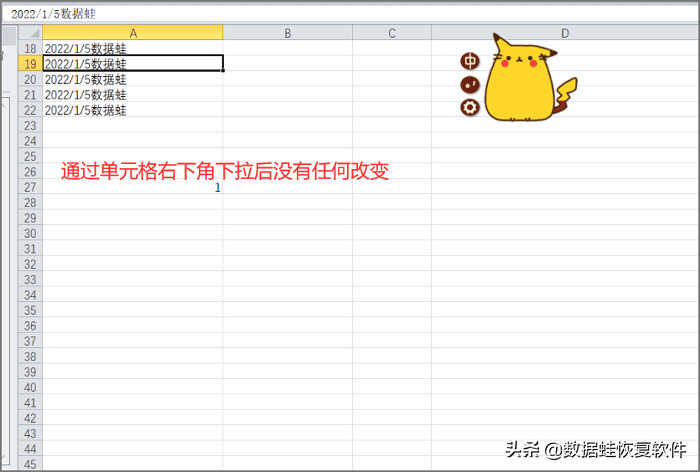 第2步:随后我们选中输入了内容的单元格,在它的右下角会有一个小“+”号,我们鼠标左键摁住这个小“+”号往下拉,却发现下拉的内容没有任何改变;