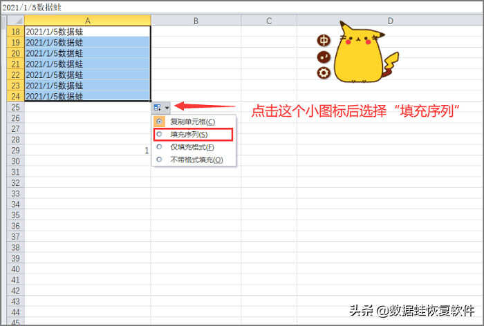 第3步:这是我们只需要点击下拉之后才会出现的一个小图标,这个就是自动填充的设置,我们点击后将其填充模式改为“填充序列”,随后可以看到,数字内容发生改变,恭喜递增成功!
