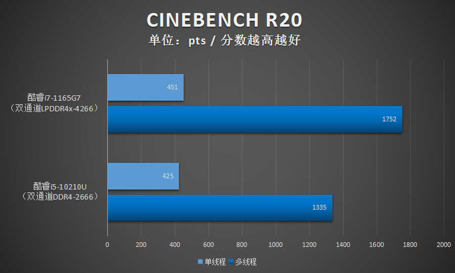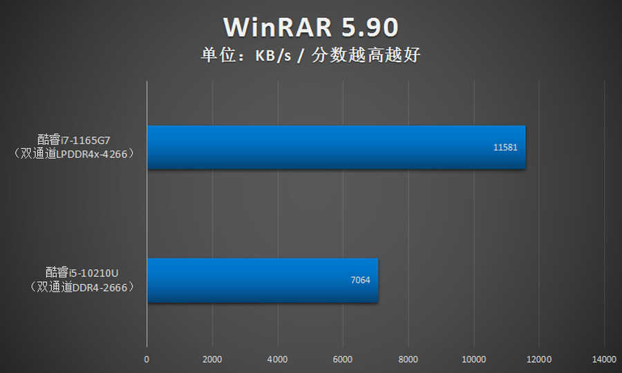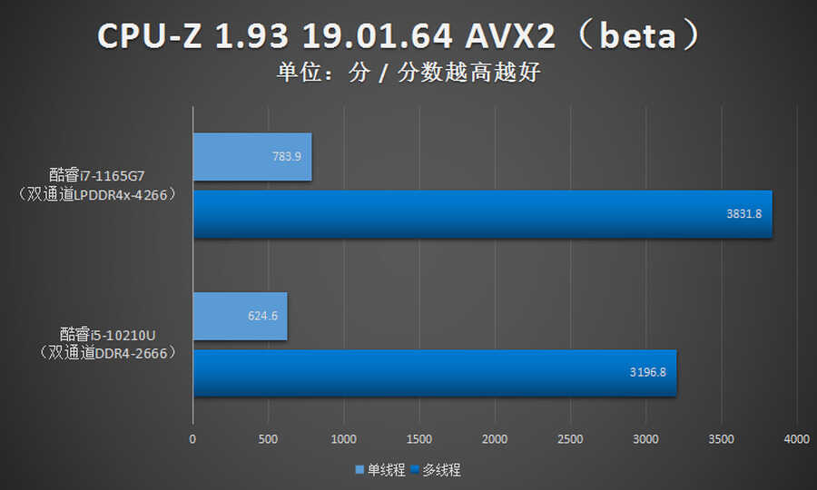 为了对比酷睿i7-1165G7的性能,笔者还加入了酷睿i5-10210U处理器的成绩。测试机选用的是联想小新 Air 14 2019款笔记本。