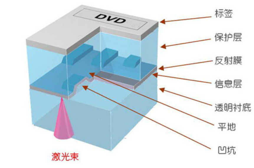 金属材料会反射播放器光驱发出来的激光,从而与机器融为一体,在电视上显现图像。然而反射面并不是存储信息的地方,真正储藏着视频的记录层藏在反射层之下。别看光盘长得薄,平均厚度不到1.2毫米,但是它们的结构里面有三层。我们看到的最亮的反射面只不过是它最外面的一层,也是最薄的一层。光盘一般会有2片基板,采用的是聚碳酸酯制成。