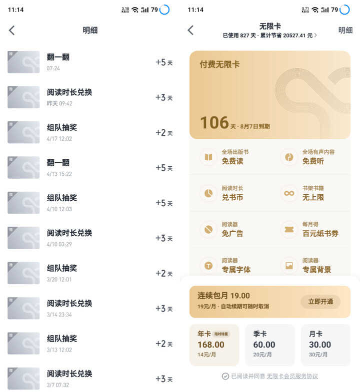 2018年,微信读书上线了“阅读无限卡”,类似Kindle的包月会员,有效期内用户可以免费看微信书城的资源。