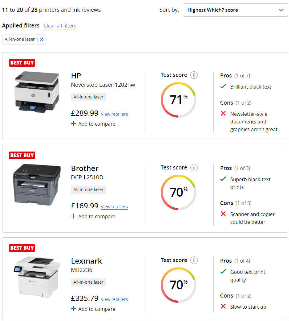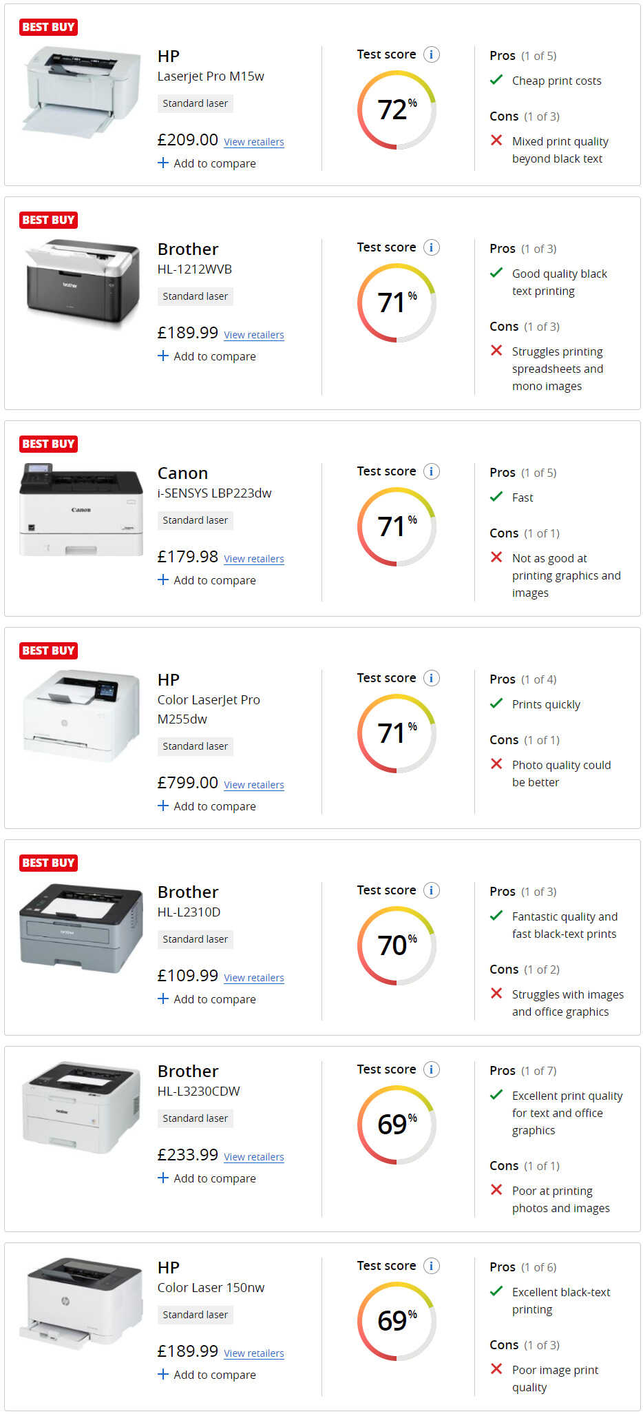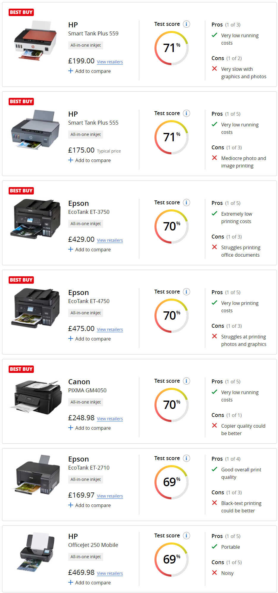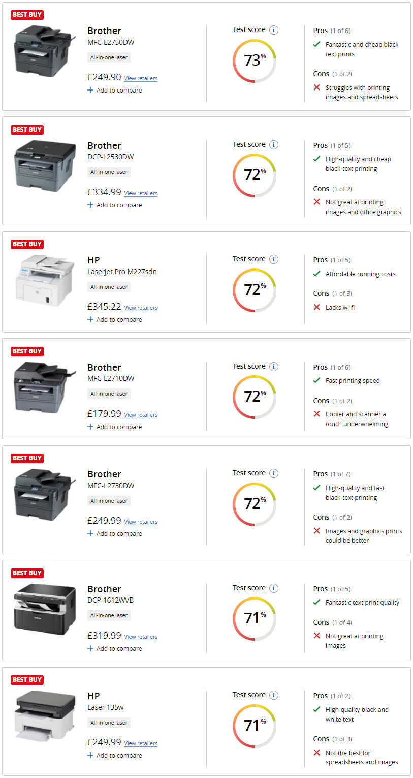 你已经知道选择哪个品牌了吗?你还可以参考英国消费者组织通过独立、专业的全面测试,从189款测试过的打印机中精选出的如下最佳60款,其中绝大多数获评“最佳选择”( Best Buy)。英国消费者组织之所以在实验室进行非常严苛的测试,是因为想帮助消费者选择合适的打印机。