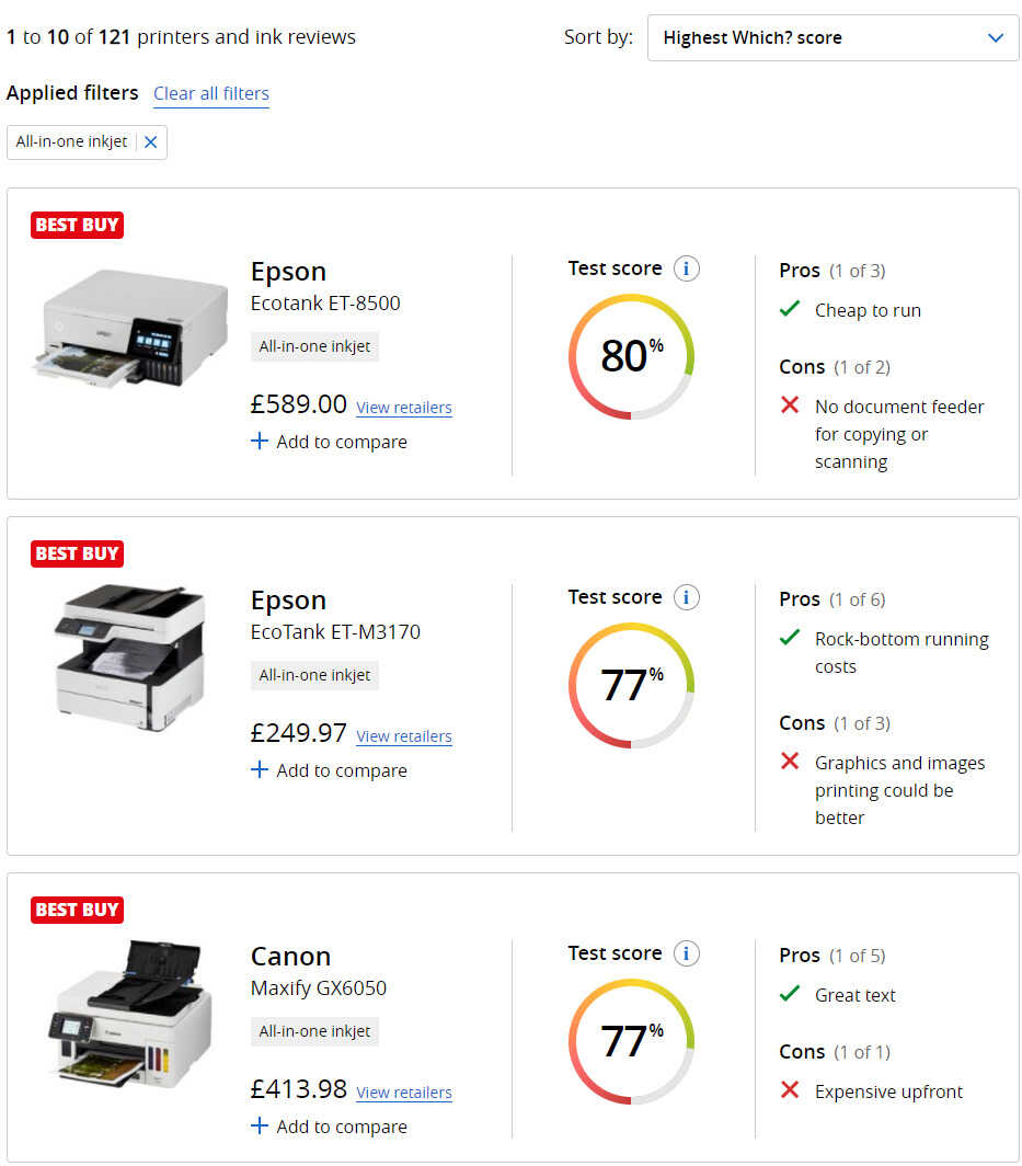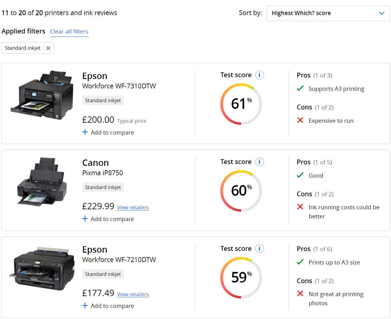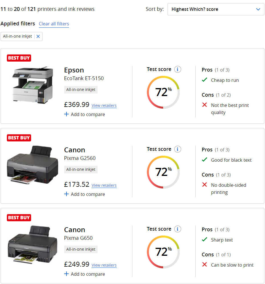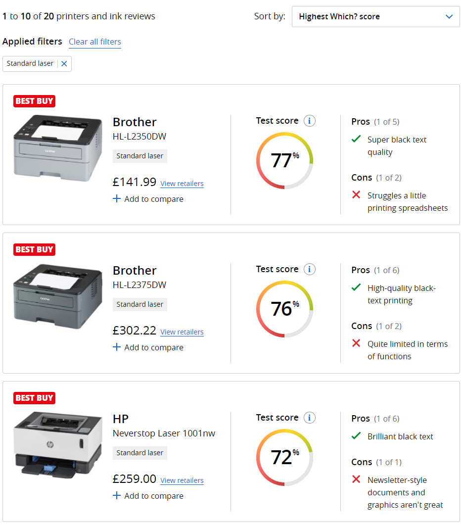 你已经知道选择哪个品牌了吗?你还可以参考英国消费者组织通过独立、专业的全面测试,从189款测试过的打印机中精选出的如下最佳60款,其中绝大多数获评“最佳选择”( Best Buy)。英国消费者组织之所以在实验室进行非常严苛的测试,是因为想帮助消费者选择合适的打印机。