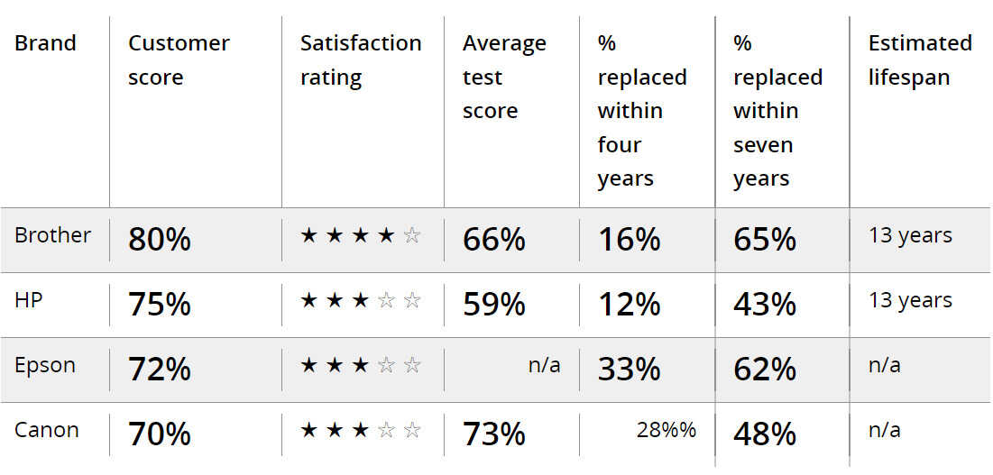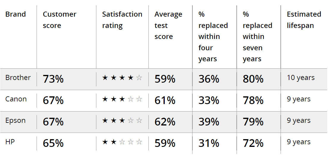 为了知晓你的打印机可以使用多久,为每个品牌计算出了平均预期寿命,计算的依据是受访者因为他们自己不可控的问题而不得不更换打印机之前所使用的时间。