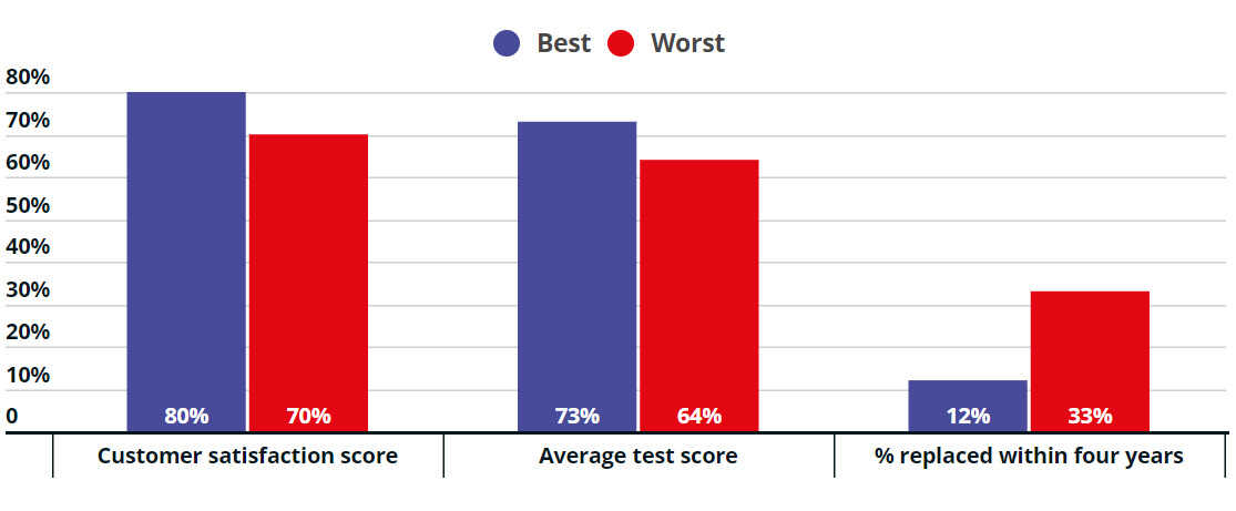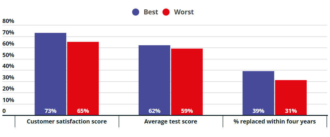 最佳与最差用户满意度得分、平均测试得分、4年内更换比例