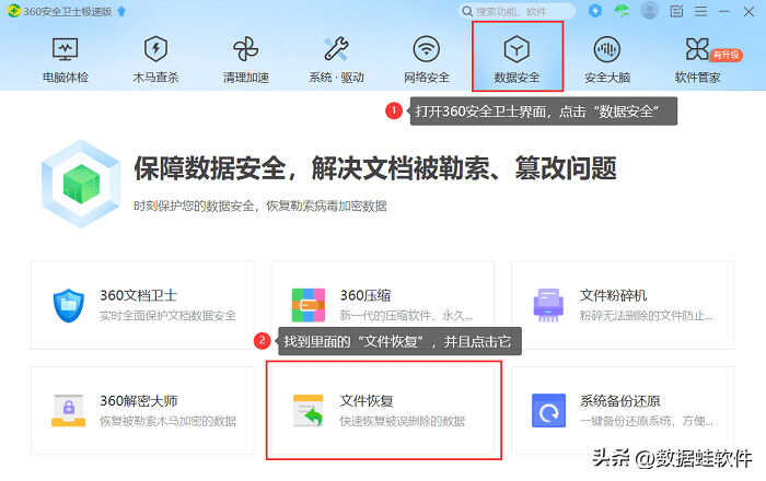 除了上面的两种方法,还有什么方法可以恢复丢失的dII文件吗?有的,如果你电脑里安装了360安全卫士,那通过360也能达到恢复的效果。打开360安全卫士界面,点击“数据安全”,找到里面的“文件恢复”,并且点击它。之后在弹出的搜索框里输入“dII文件”,找到缺失的dII文件,点击立即修复就可以了。