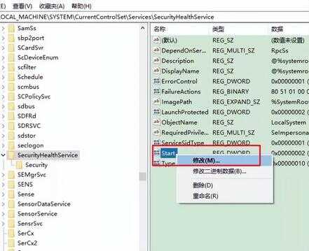 4、在“SecurityHealthService”项下,找到右侧窗口中找到【Start】并鼠标右键点击,选择【修改】。