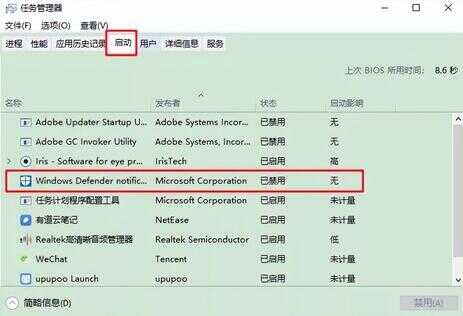 8、点击【启动】,在启动的选项卡中,使用鼠标右键点击“Windows Defender notification icon”将其禁用(如果有两个相同的都禁用),重启电脑即可。