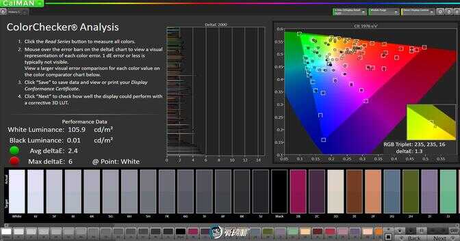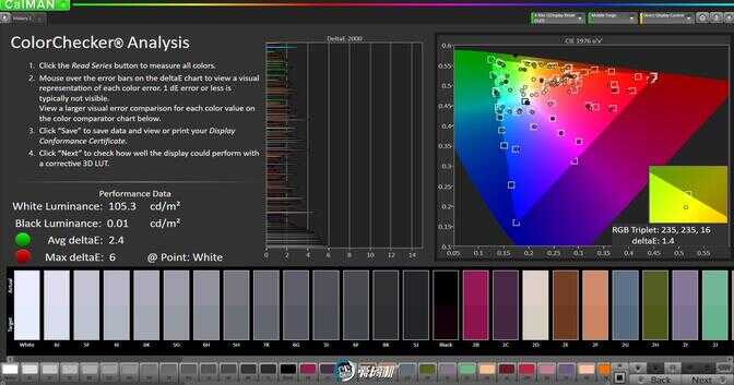 自然模式色温 7522K,覆盖 95.7% sRGB 色域,平均灰阶偏离 4,sRGB 色域下平均色彩偏离 2.4