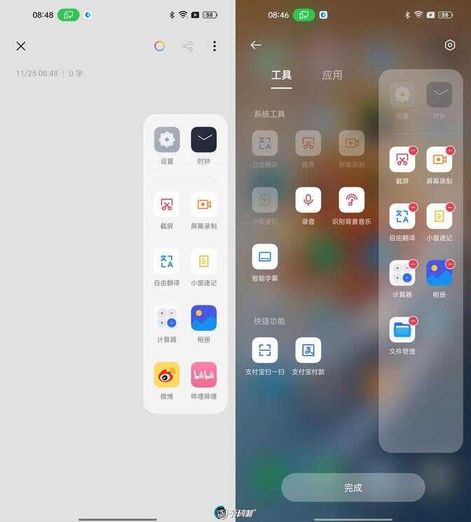 智能侧边栏 2.0 则是将原来仅有一列的侧边栏扩展为两列,当中可以放置需要快速启动的浮窗应用、小程序以及翻译、字幕等小工具,而且系统还会根据当前应用场景推荐可能用到的浮窗小工具。