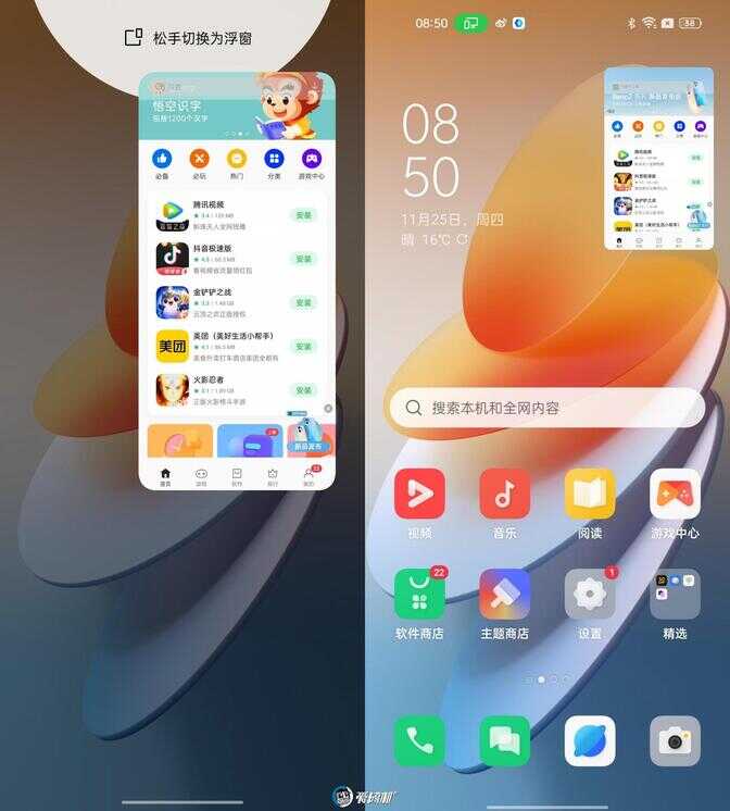 在上滑呼出多任务的基础上继续上滑即可将当前应用挂起为浮窗形式,然后点击可切换为小窗,移至侧边则可以最小化形式在前台运行,对于有在前台同时运行多个任务需求(如一边刷游戏副本一边看别的应用)的用户,自由浮窗可以说非常实用。