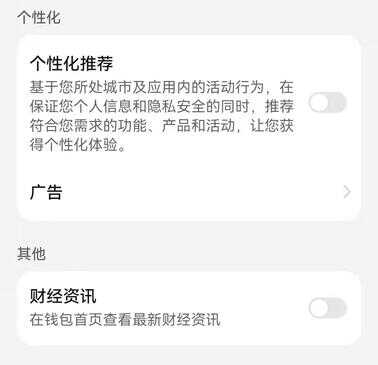 打开华为钱包,打开钱包以后需要我们点击右边的我的,然后有一个其他设置选项,我们点击当然里边会有个性化推荐,我们需要把它关闭,然后的话大家会看到下方会有个资讯,我们需要把它关闭,然后点击广告,广告里边会有一些个性化广告,或者是华为广告三方广告,我们需要都把它关闭,这样的话你的手机基本上彻底关闭了广告。