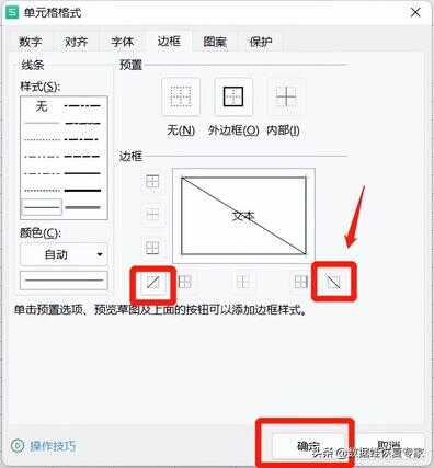 步骤二:在单元格格式的对话框中选择【边框】,根据自己的需求,选择斜线的方向,选择完毕点击【确定】。