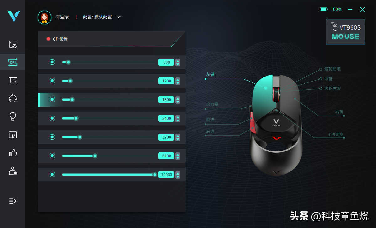 操控方面,雷柏VT960S采用了原相的3370光学引擎,分辨率范围为50-19000DPI,系统预设了800、1200、1600、2400、3200、6400、19000等7档档位,当然你也可以以50PI为单位自定义7个档位。