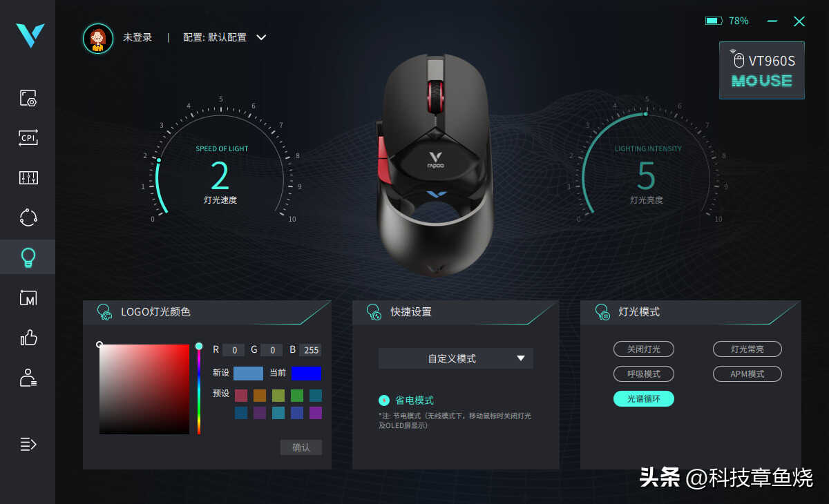 V+无线游戏技术的另一使命就是提升无线鼠标的续航性,它在雷柏VT960S的内部植入了一块Nordic低功耗芯片,在低功耗的介绍上再加以智能省电算法,让鼠标在工作、睡眠、唤醒等不同状态下均能保持较低功耗,大幅度提升鼠标的续航时间。同时,玩家还可以在驱动软件上选择炫酷模式、节能模式、均衡模式、自定义模式来获得不同的续航体验。