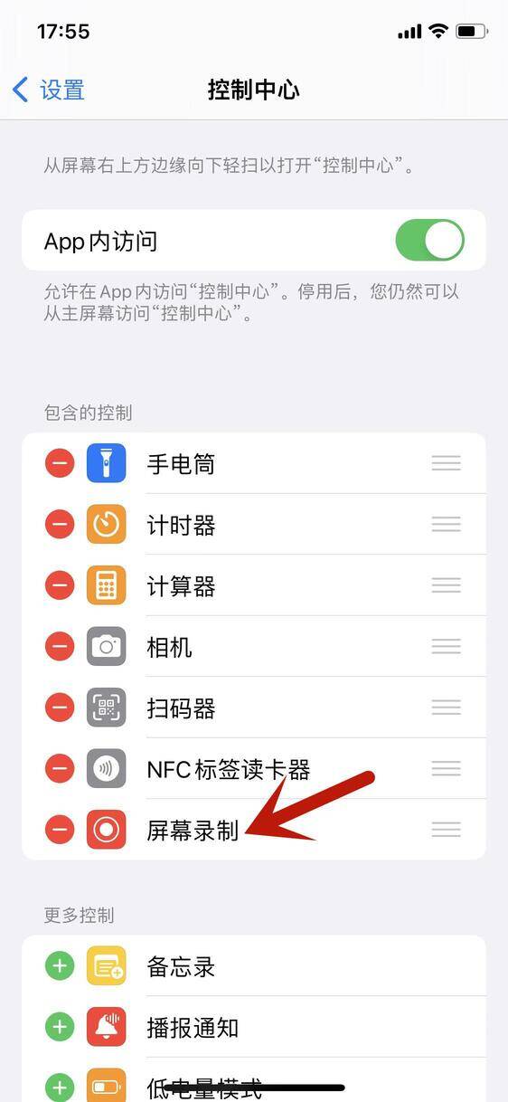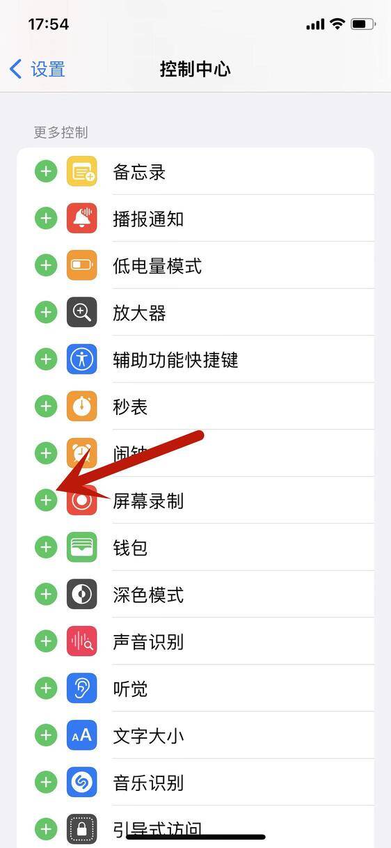 3、在“控制中心”里找到“屏幕录制”,点击旁边的“+”号发现其消失