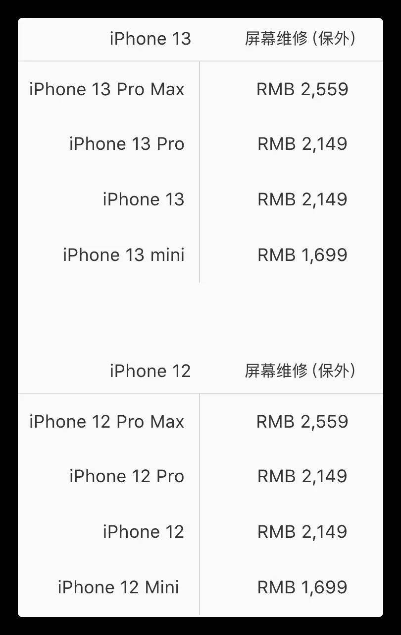 以 iPhone 13 系列为例,最便宜的 iPhone 13 mini 维修起来都要 1699 元。