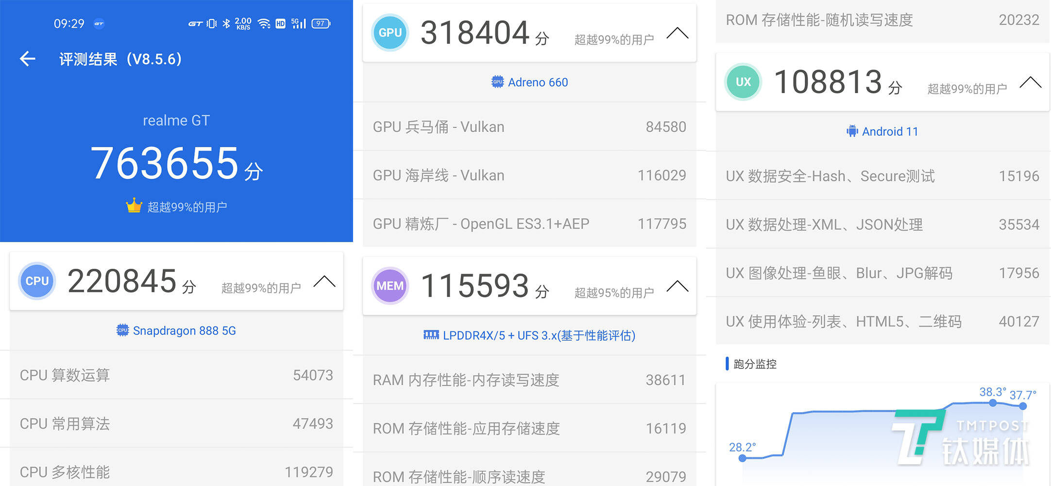 搭载骁龙888的realme GT在安兔兔中的实际跑分表现如下图所示: