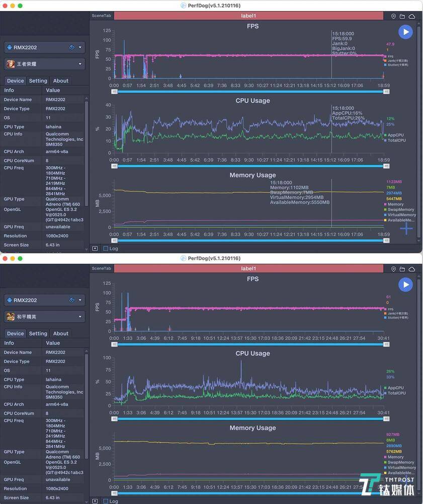 王者荣耀帧率(上图);和平精英帧率(下图)