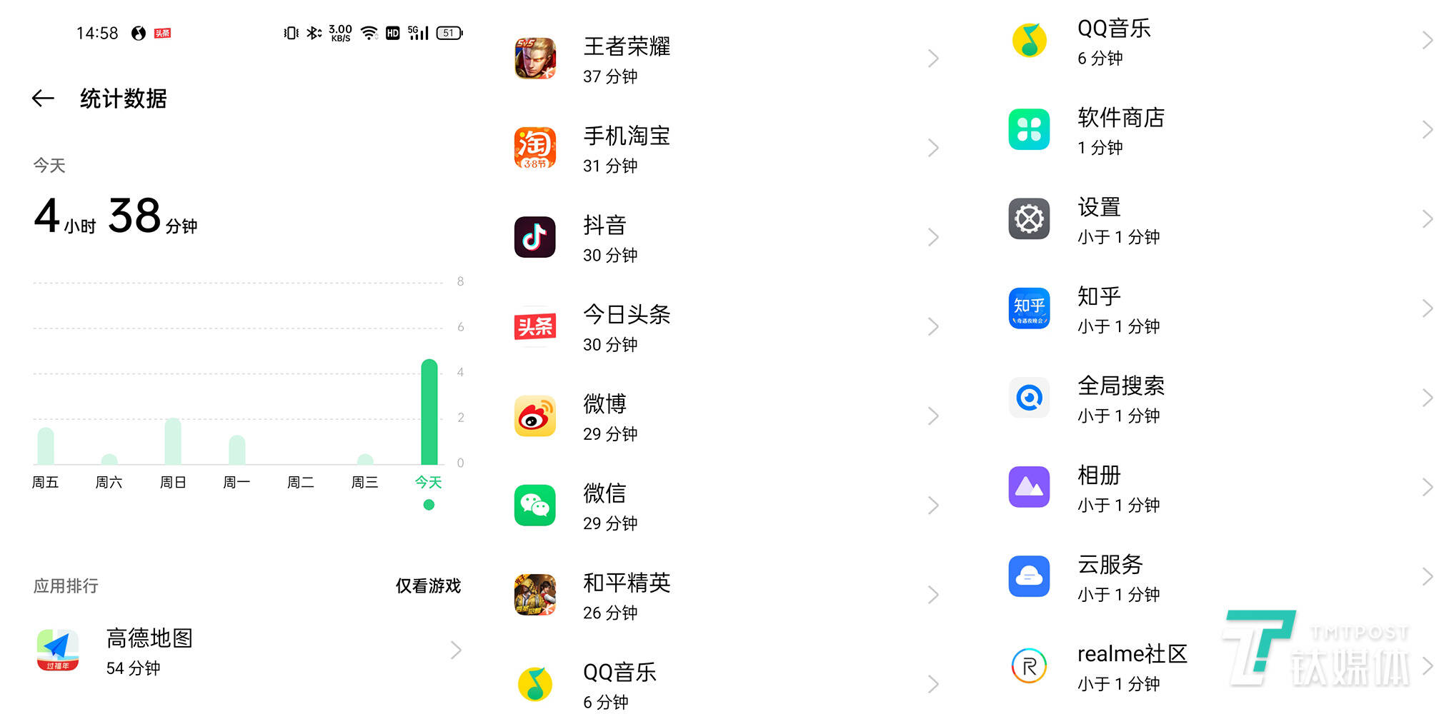 经过一轮测试下来,realme GT剩余电量为51%。根据笔者自身的经验而言,即便是重度的手机游戏玩家,它也能坚持一个白天的使用;如果关闭GT模式,游戏的画面配置调低一档,保持最高帧率,它也能坚持整整一天的使用。