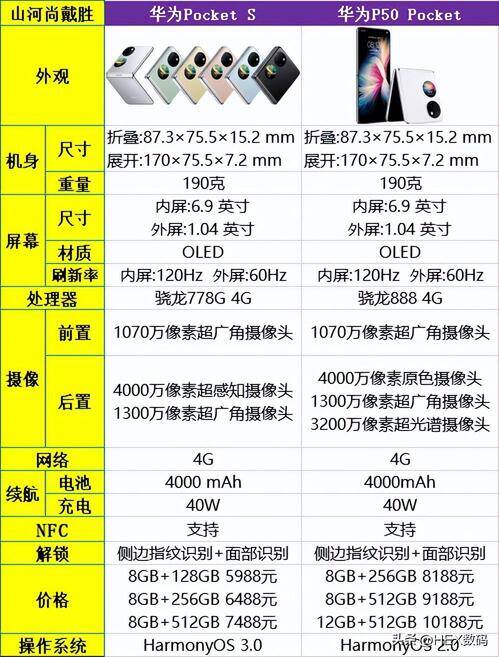 首先来比较一下华为Pocket S和华为P50 Pocket参数配置:
