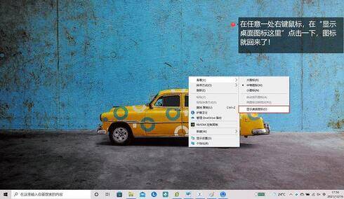 方法一:桌面任意一处右键我们的鼠标,将没有打勾的“显示桌面图标”选项果断点击勾回去。