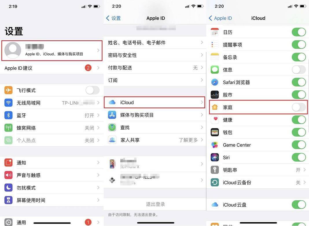 1、打开“设置”,选择AppleID个人账户,点击“iCloud”将“家庭”后的开关调整为关闭状态。