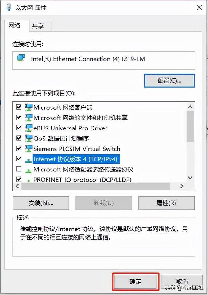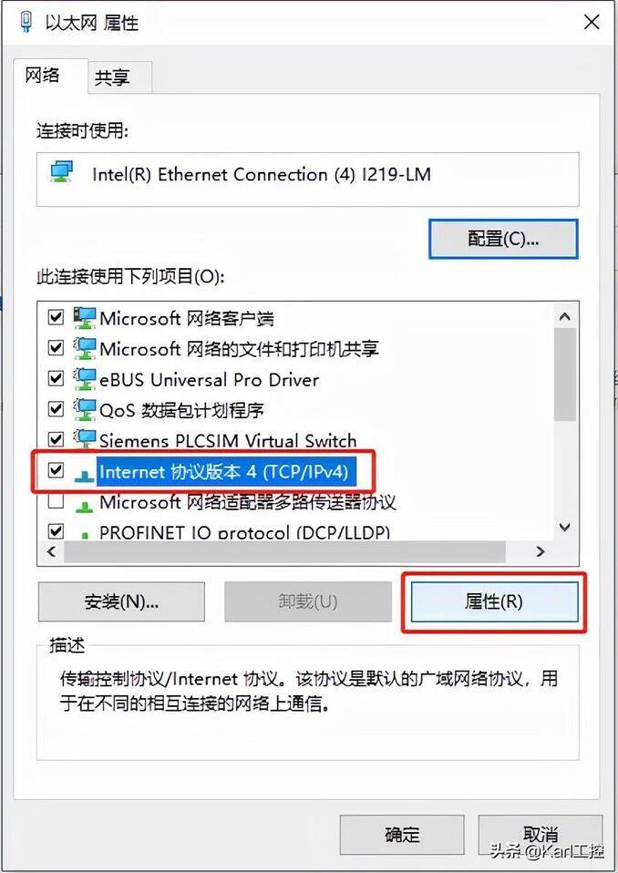 - 在弹出的以太网属性窗口中,选中【Internet协议版本4(TCP/IPv4)】后,点击【属性】,进行属性设置