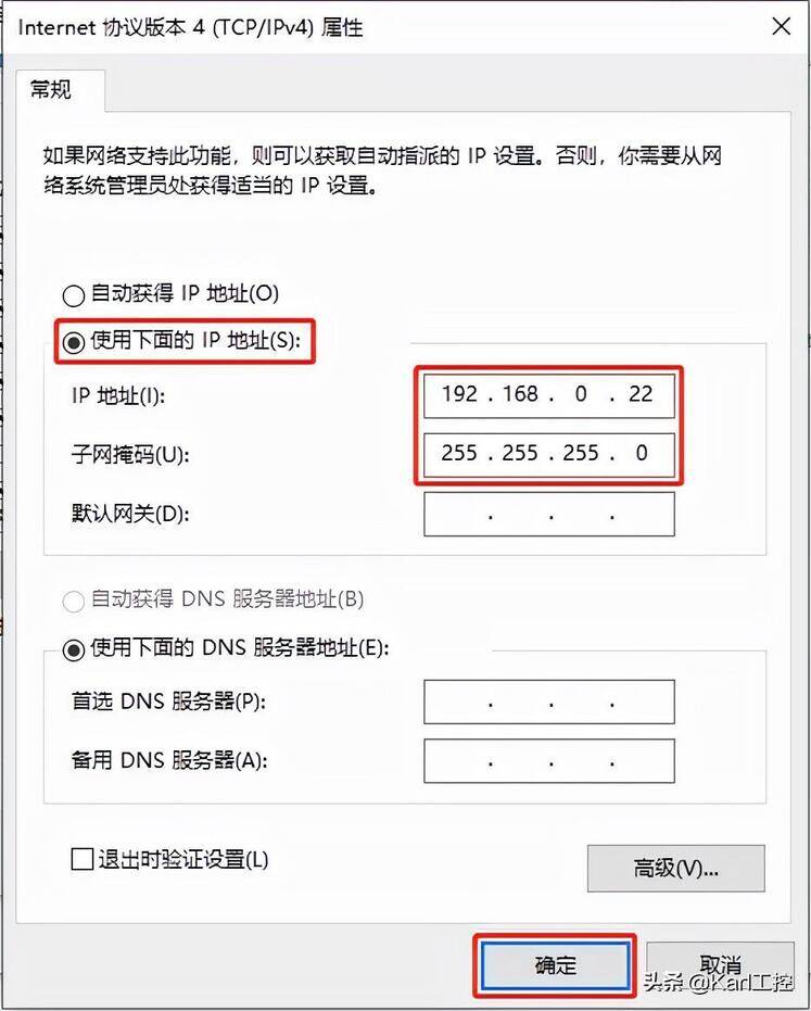 - 在弹出的属性窗口中,选择【使用下面的IP地址】。在IP地址后输入需要设定的IP地址,在子网掩码后输入需要设定的子网掩码地址,设置完成后点击【确定】