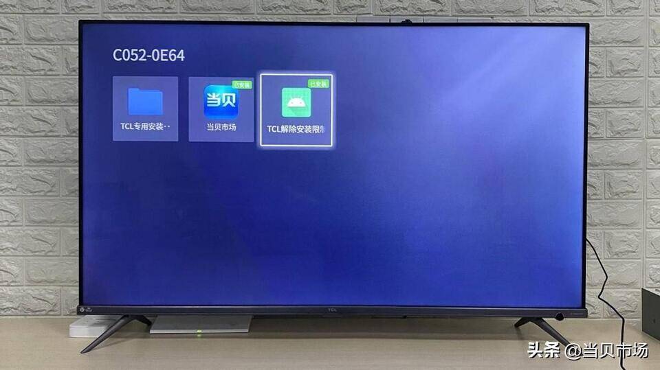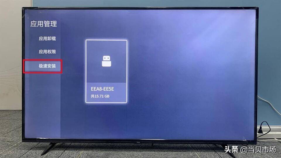 将U盘插到电视上,在【电视卫士】找到【应用管理】-【极速安装】,打开U盘文件夹,安装【当贝市场】和【TCL解除安装限制】。