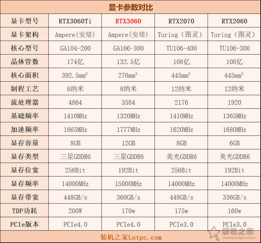 从参数上来看,RTX3060和3060TI的差别就很大,3060采用的是GA106的核心架构和3060TI采用的是和RTX3070同宗同源的GA104的核心架构,流处理器的差别也非常大,3060TI是4864颗流处理器而3060只有3584颗,至于显存位宽,显存频率等也都有一定的差距。
