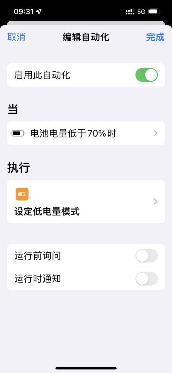 低电量模式应该被好好利用,不打游戏的情况下,大概能将iphone续航延长一倍。当然,我们既然买了手机,肯定希望用得爽,所以一直开着低电量又感觉亏了自己。这时就可以用快捷指令中的自动化,设定手机电量低于某个值时自动开启低电量模式,我设定的值是70%,小伙伴们根据使用情况自行调整即可。