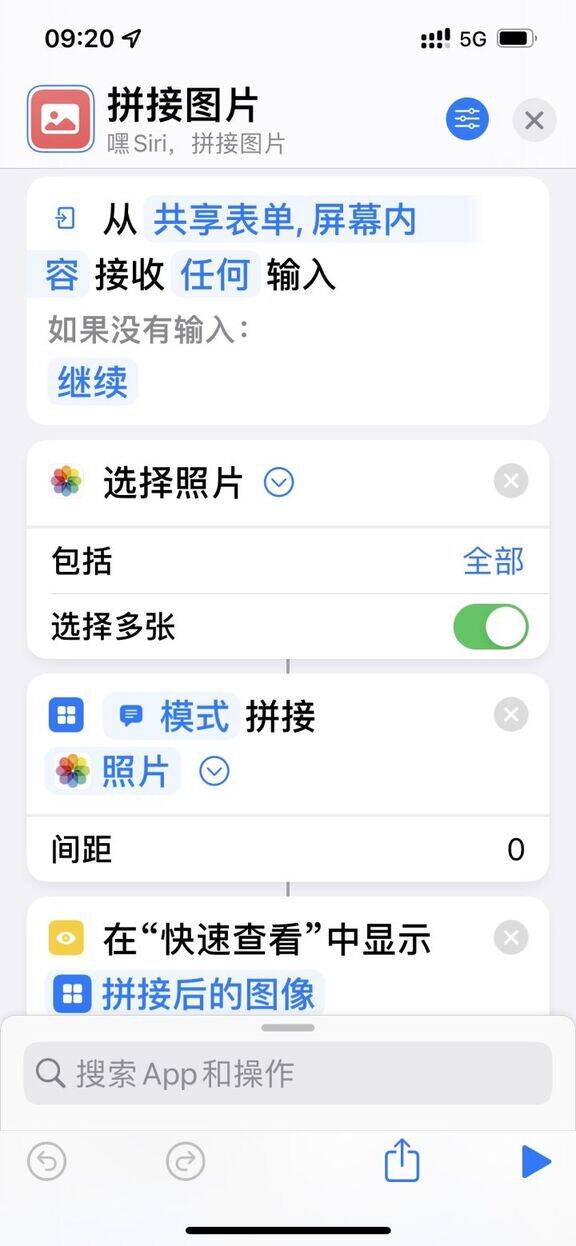 第1步是为了方便你在相册中选中多张图片后,以共享方式分享至此快捷指令,不需要的可以去掉,直接从第2步开始;第4步是显示拼接后的图片,方便分享给他人;至于2、3两步,大家都懂,先选择照片,然后按照“模式”拼接照片,至于模式都有哪些,运行一下快捷指令就知道了。其中,第3步的“间距”指的是图片拼接时,图片之间留白的距离,可以按照个人喜好调整。