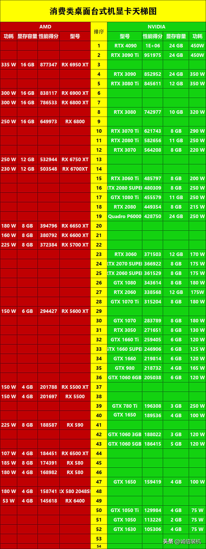 显卡是电脑配置中最重要的组成部分,对于一些玩游戏,从事图形设计或者视频剪辑的人们来说显卡极其重要,显卡的预算一般占整个电脑预算的三分之一,更有甚者能达到一半以上,可以说一个电脑的显卡好坏能瞬间提升整个电脑的档次高低。目前市场上主流的显卡厂商是AMD和NVIDIA,intel因为是今年刚入局不长,小编先不阐述。很多小伙伴看到型号众多的显卡不知如何选择,小编根据鲁大师的测试数据做了一张天梯表格,让大家从性能得分显存功耗一目了然,希望可以帮到大家
