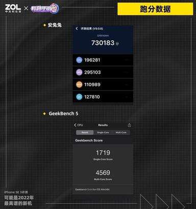 首先进行的是基准性能测试,在的安兔兔V9版本跑分测试中,4GB RAM的iPhone SE 3获得了73W分的成绩,这一成绩接近iPhone 12的表现。在能够准确反映手机SoC CPU部分性能表现的GeekBench 5测试中,iPhone SE 3的GeekBench CPU单核跑分实测成绩为1719分、CPU多核跑分成绩为4569分,整体得分基本与iPhone 13持平。