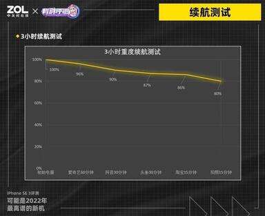 在续航方面得益于苹果A15的高能效优势和电池容量增大所带来的续航时间提升,iPhone SE 3的续航表现相比上代机型有明显提升。100%电量的iPhone SE 3在经历包含了拍摄、视频观看、信息流浏览使用在内的3小时续航测试后,其剩余电量为80%,相比目前的主流旗舰机型续航表现偏弱,但是在小尺寸手机中表现优异。