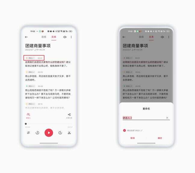 同时支持编辑讲话人的名称,这样做可以使得文本记录变得更加一目了然。